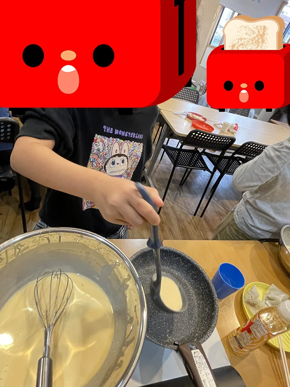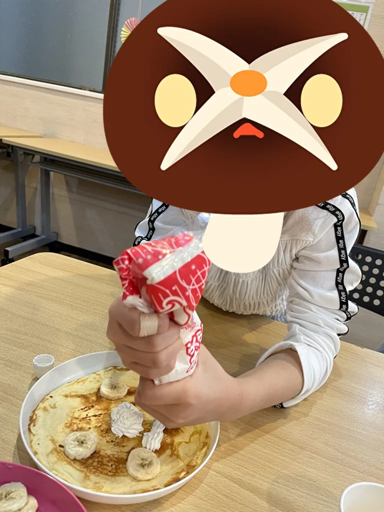 実際にどうやったらおいしい生地が出来るか皆様に頑張ってもらい、各お子さまに合わせたトッピングもつけて、自分が一番好きになれるクレープを完成させました。