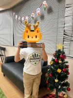 教室にあるクリスマスツリーの前で、トナカイのカチューシャをつけて記念撮影!