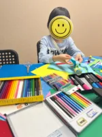 たくさんのペンや色鉛筆に囲まれて、オリジナルな作品を作っていきます。