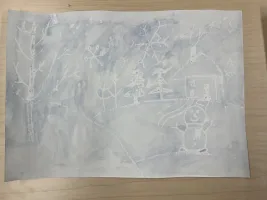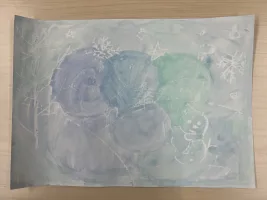 画用紙にクレヨンで好きな絵を描き、水を多く含ませた絵具を上から塗っていきます。