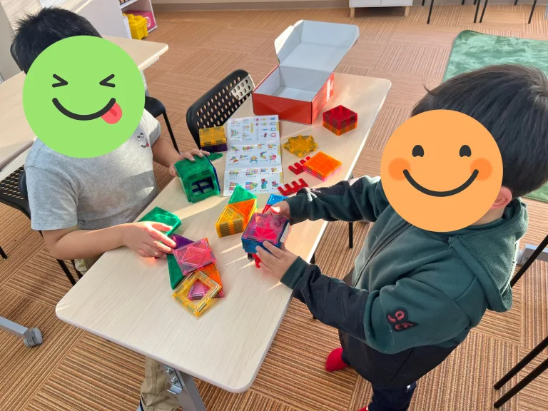 一人で黙々と集中する時間も大切ですが、お友達との関わりも大事な要素です。 「この四角いパーツ貸して」「いいよ、こっちに使ってないのあるよ」 そんなやり取りをしながら、一つのテーブルでそれぞれの作品作りに没頭しています。