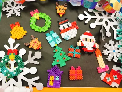アイロンビーズでクリスマスモチーフを作ったり、折り紙や塗り絵で壁を彩ったり。