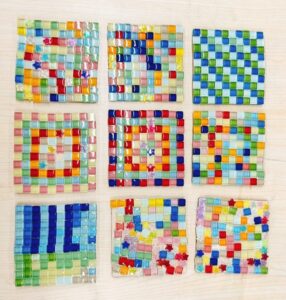 小さなタイルを手にしてどんなデザインにするか考え、カラフルなタイルの中から、自分の好きな色や形を選び、「お花にしようかな?」「カラフルな感じで色を変えて作ってみようかな」と、夢中でデザインを組み立てていきました。