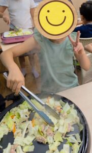 ジュージューという音と、立ちのぼる湯気、そしてソースの香ばしい香りが教室いっぱいに広がると、子どもたちのテンションは最高潮に!「わー!すごい!」「お祭りみたい!」と、あちこちから歓声が上がります。