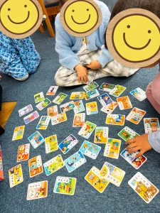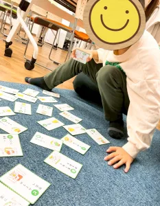 最初は難しそうにしていた子も、遊びを通して何度も同じ言葉に触れることで、次第に意味を理解し、素早く札を取れるようになっていきました。