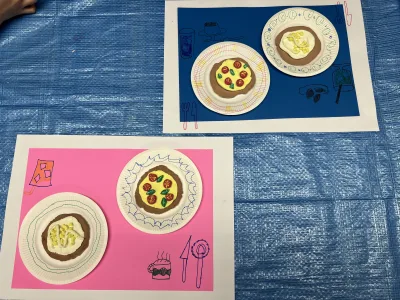 お気に入りのピザはコーンマヨ。どの絵の具を使ったらコーンの色になるかな?と試行錯誤しながら、一つ一つ丁寧にに作っていました。
